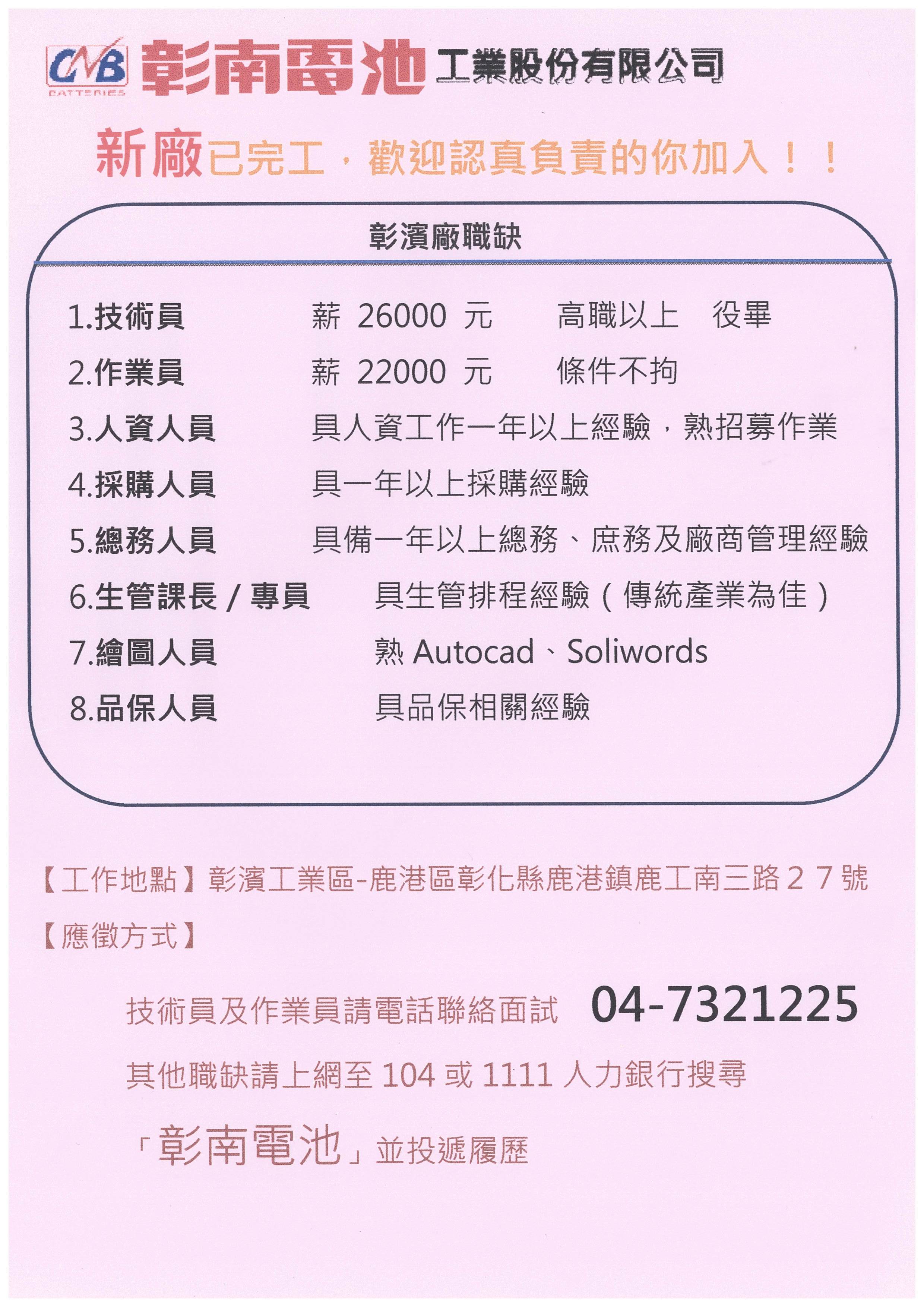 彰南電池彰濱廠職缺