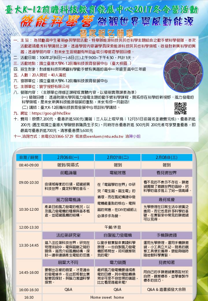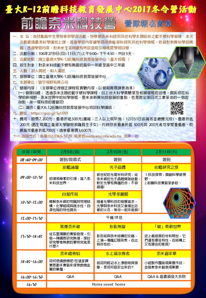 國立臺灣大學辦理「微能科學營」及「前瞻奈米科技營」營隊活動,請同學踴躍報名參加。