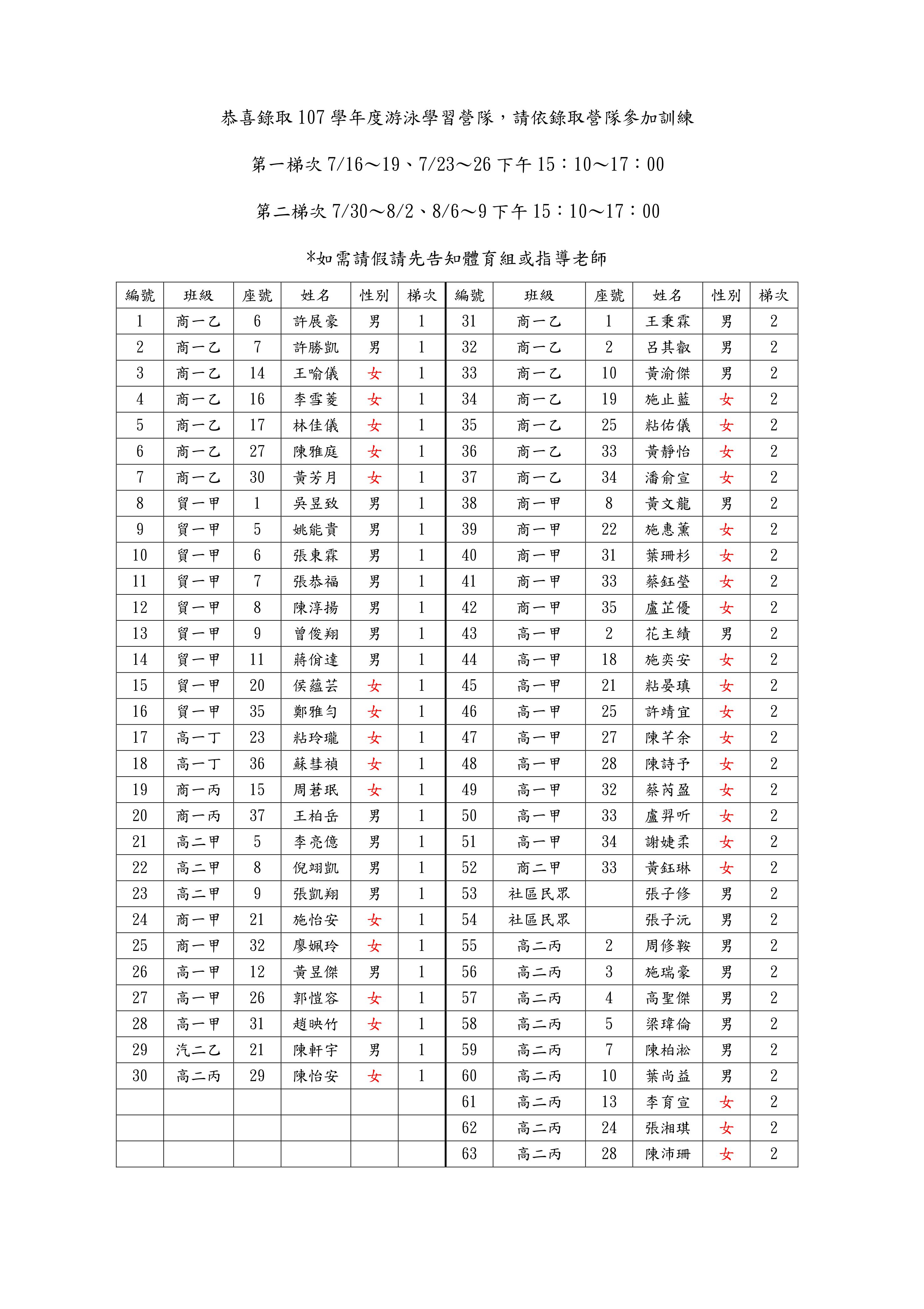 107年度游泳學習營錄取名單