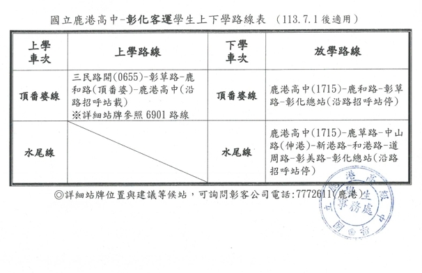1、彰客及員客為服務鹿高莘莘學子,已於本校設置站牌,上下學的起迄站轉至本校,其餘非上下課時間請參考客運路線表(鹿港站至本校需步行15分鐘)。 (非正常上課時間,如段考或結業式其放學時間有異動者,將會再公告於學校班長群組)。