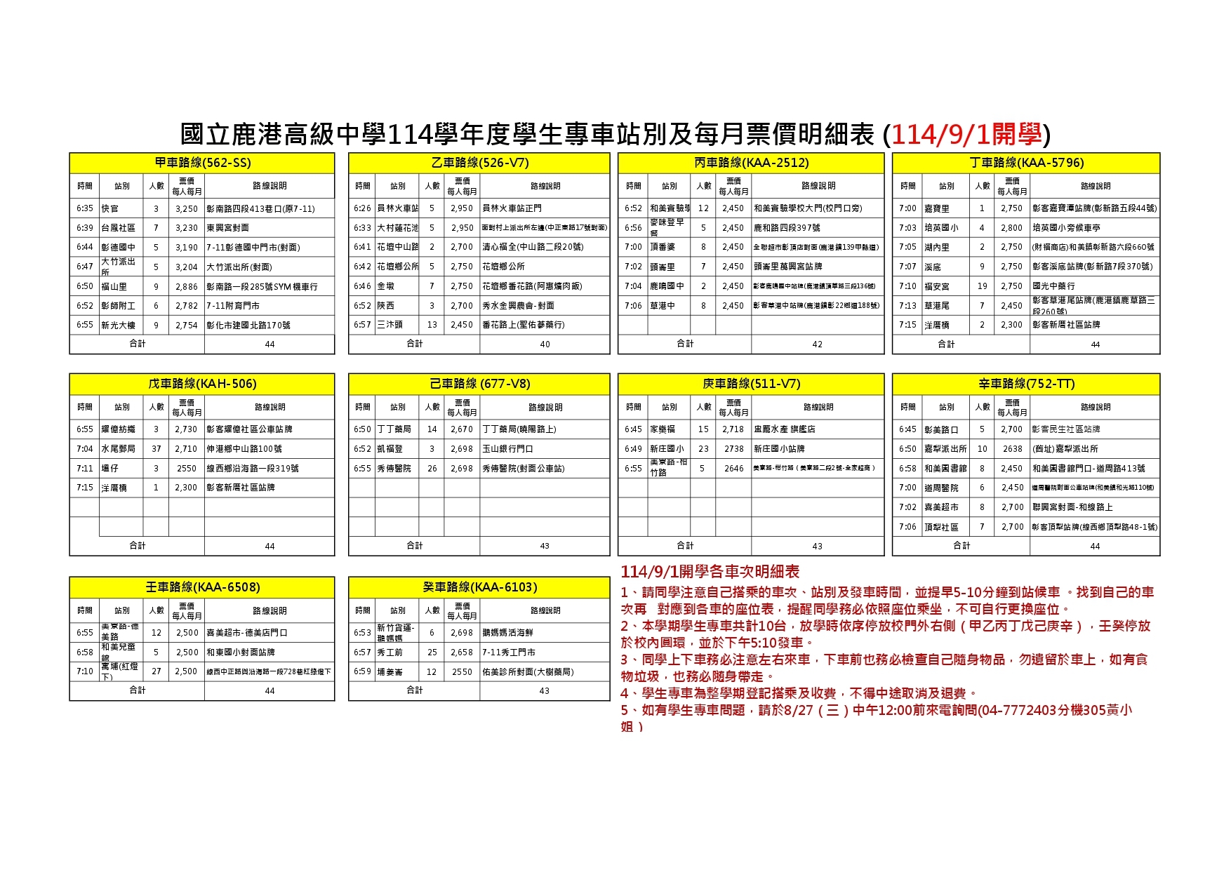 114學年度第一學期學生專車明細表 |