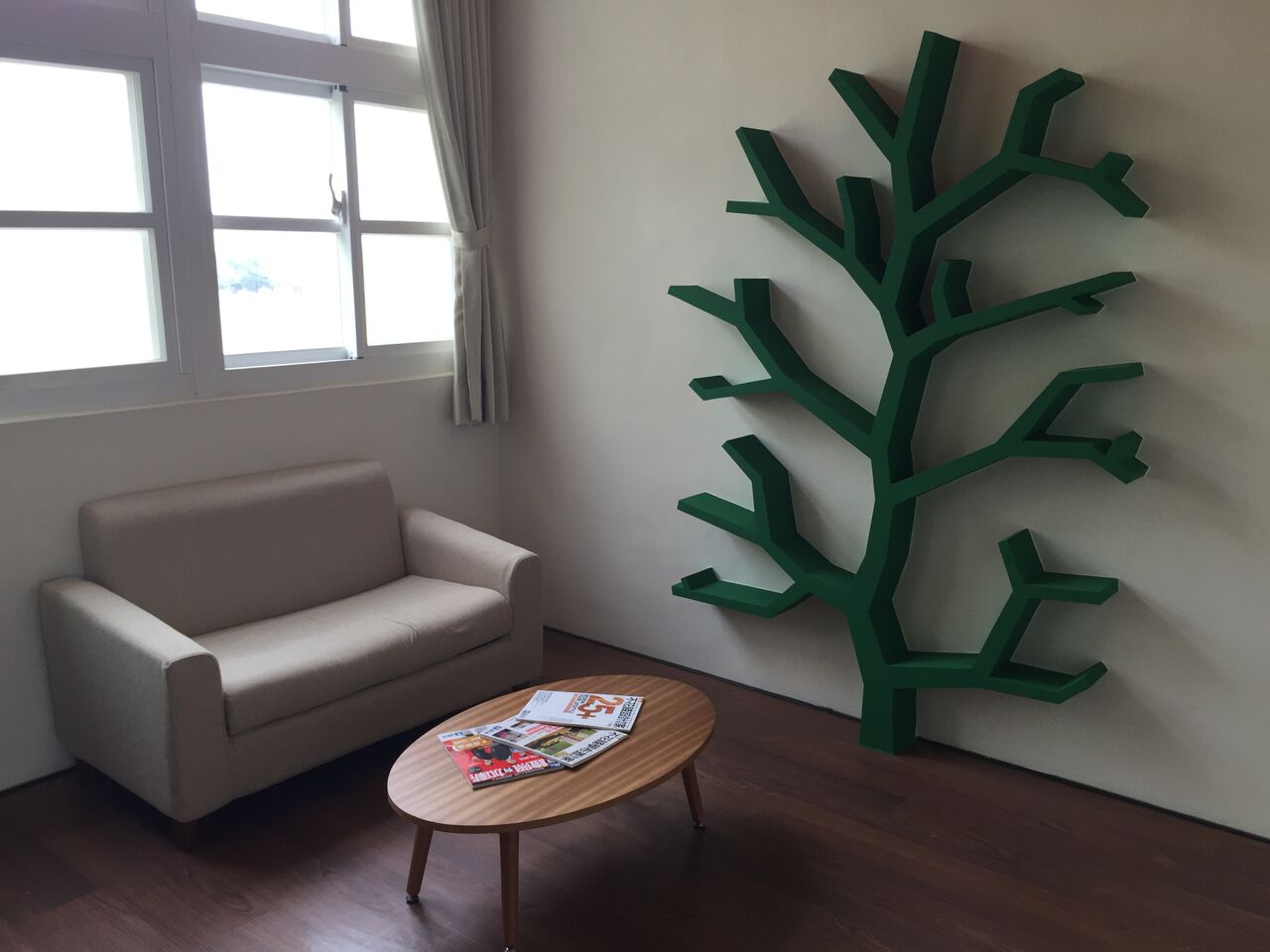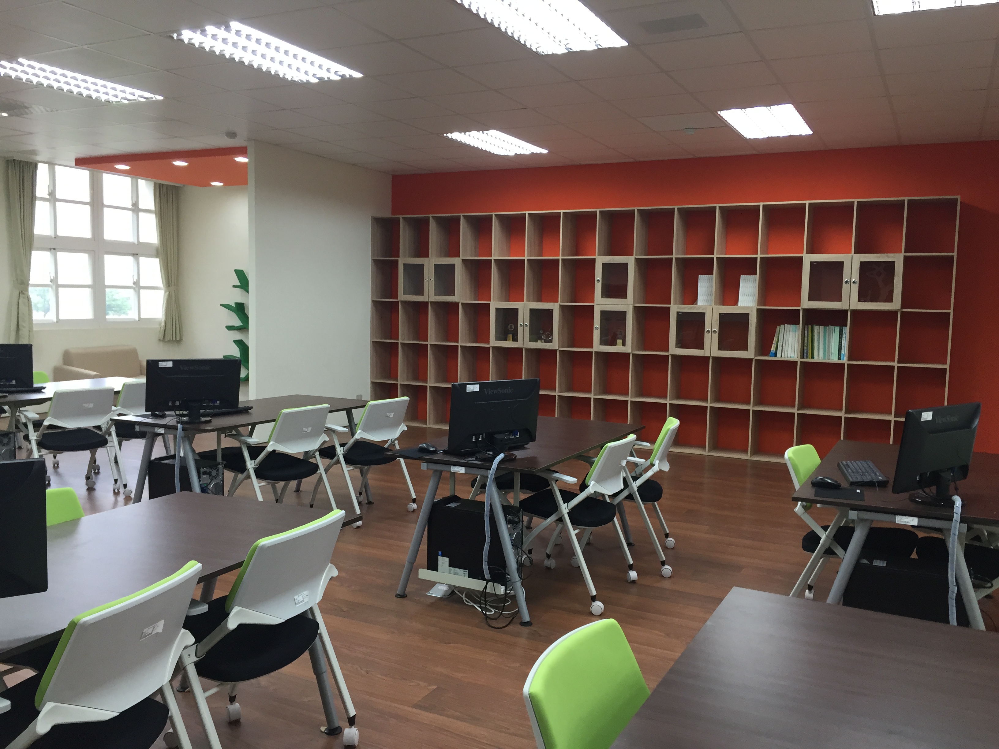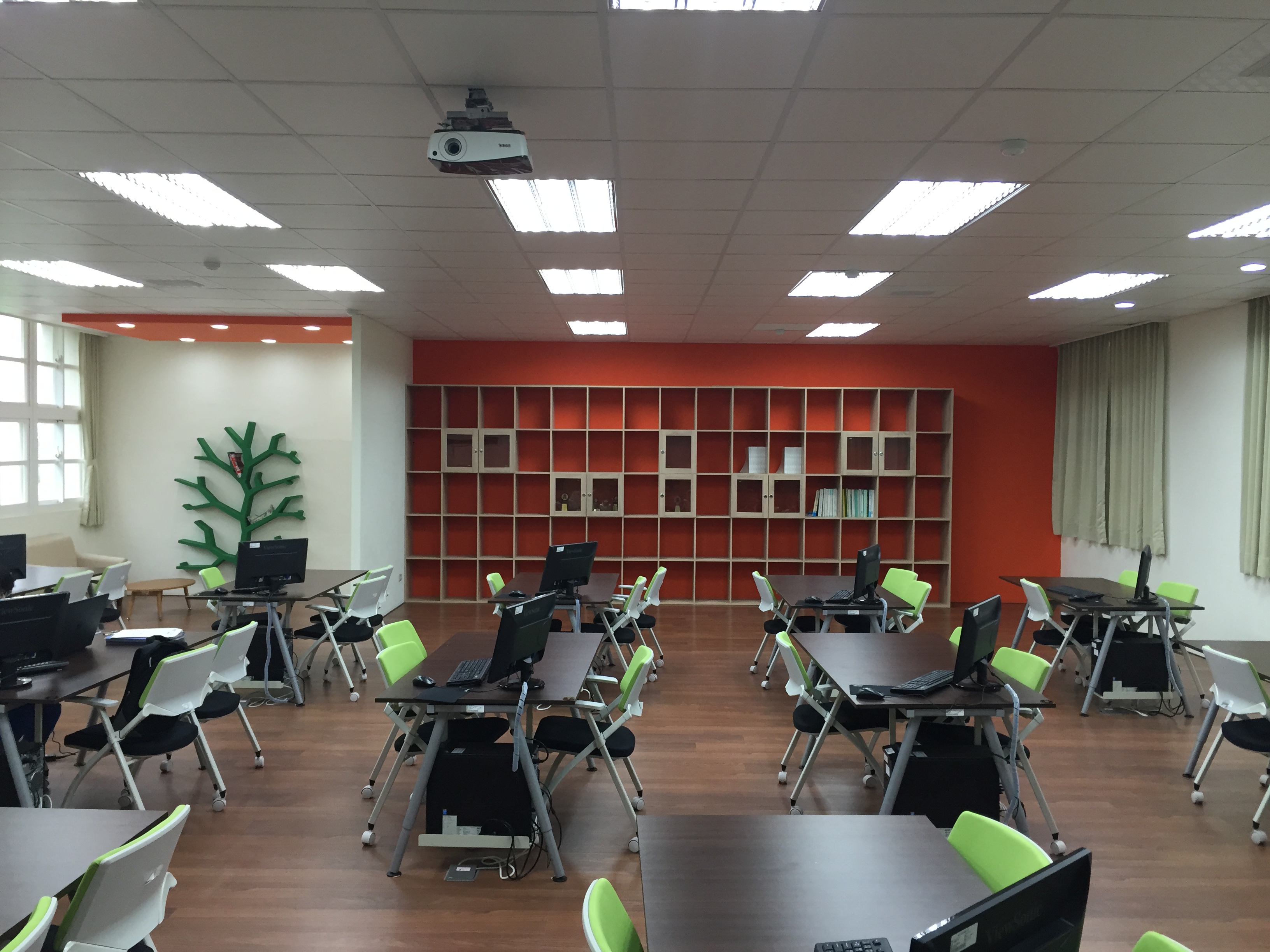 | 日式休閒風之討論空間 | 配置教學電腦之教師座位及後方樹形書架 | 配置電腦乙部之3人小組討論區(桌)共14組 | |