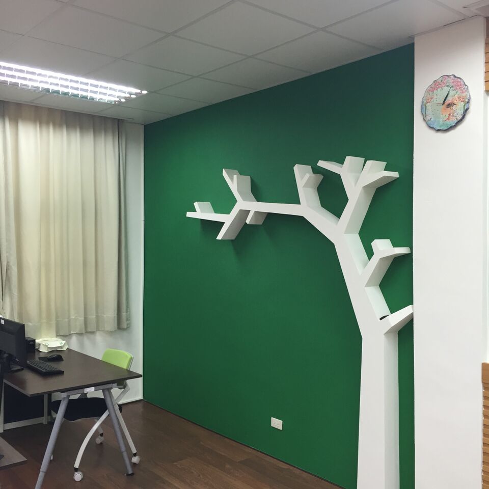 | 教室前方設置投影白板(中)、無線麥克風、水冷式冷氣(右)及樹形書架(左) | 教室後方存放專題製作用參考資料及作品之大型書櫃(右)及休閒式討論區(左) | 存放專題參考資料及惠存受贈之感謝獎牌 | |